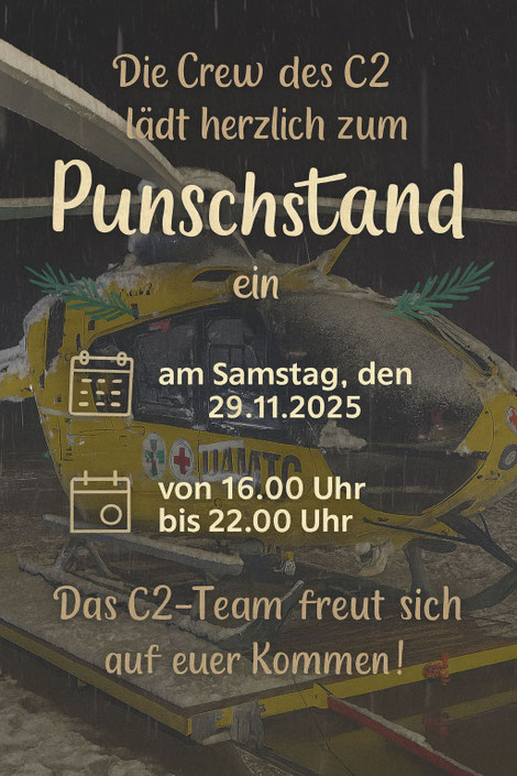 17. Oktober 2025 Christophorus 2 Punschstand 2025 Wir laden euch herzlich ein, mit uns die Vorweihnachtszeit bei einem wärmenden Becher Punsch zu genießen! Kommt vorbei, trefft das Team von Christophorus 2 persönlich und erlebt die besondere Atmosphäre unseres Punschstands. tagPlaceholderTags: Seitenblicke
